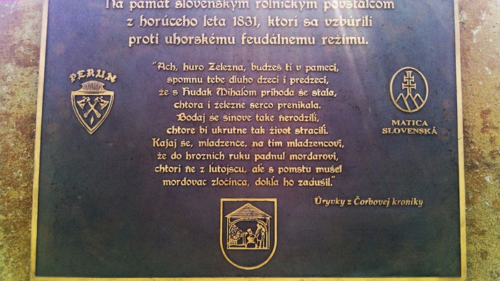 Na pamäť slovenským roľníckym povstalcom z horúceho leta 1831, ktorí sa vzbúrili proti uhorskému feudálnemu režimu" - hovorí text na tabuli pamätníka pri evanjelickom kostole.